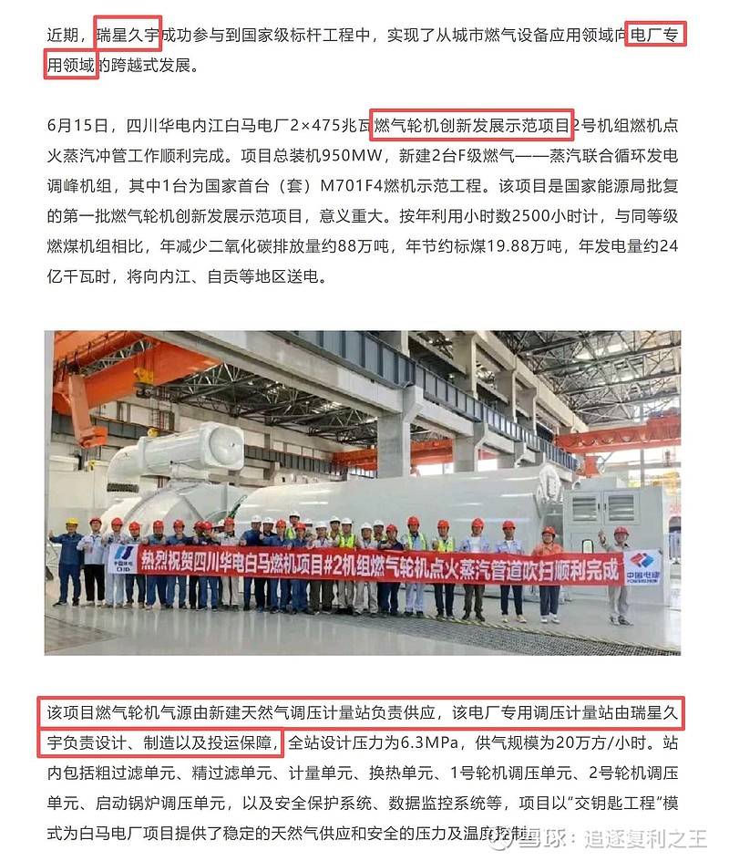 $北证50(BJ899050)$ $瑞星股份(BJ920717)$瑞星股份通过其全资子公司瑞星久宇燃气设备(成都)有限公司成功参与了国家级燃气轮机创新发展示范项目标志着公司从城市燃气设备应用领域向电厂专用领域的跨越式发展