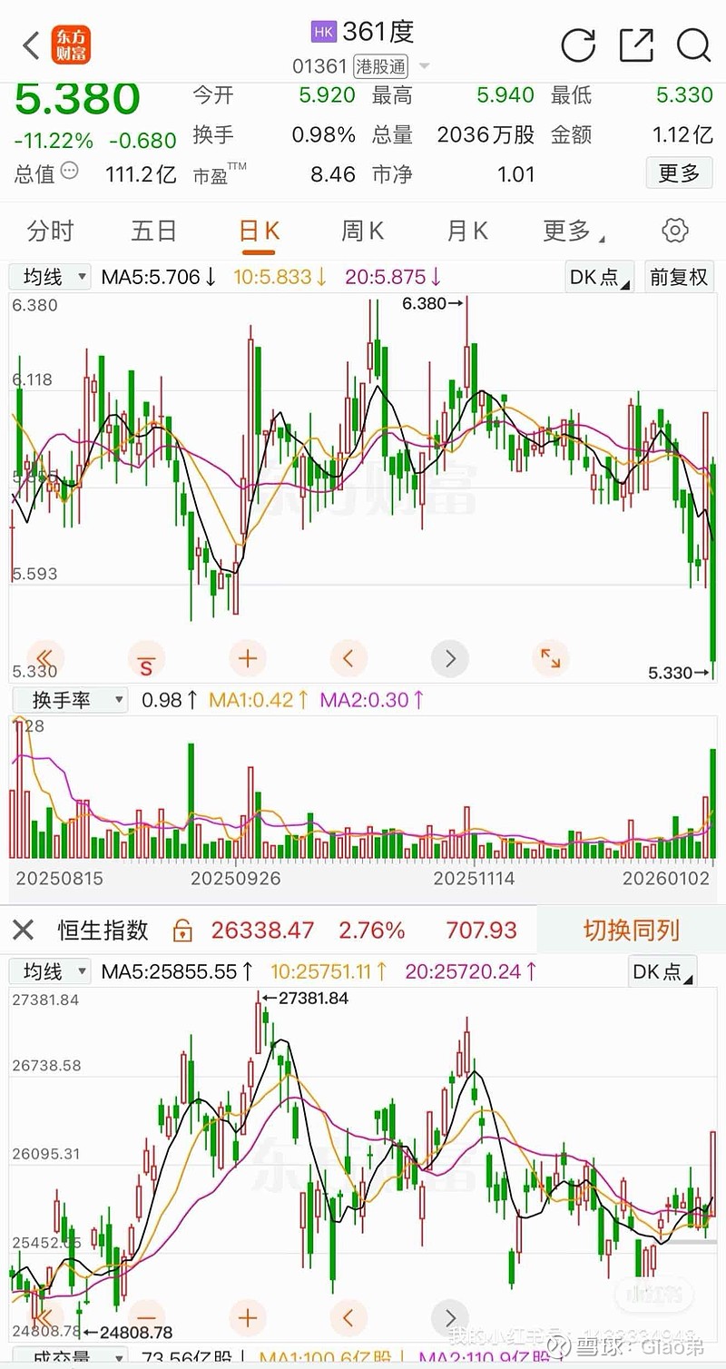 到了2026年1月2日,港股首个交易日恒生指数大涨2.76%,361度却逆势暴跌11.22%,股价跌至5.330港元的阶段低位,当晚张水华宣布离职的消息,看似是舆论事件的反转节点,股价提前的大跌或许说明了一些事情,尤其是考虑到离职程序的耗时和insider information的情况。