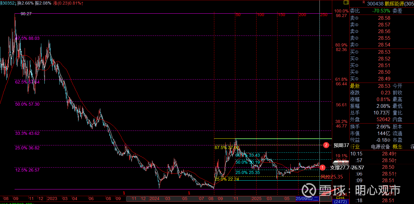 2.价格,百分比显示当前支撑27.7-26.57,该价格区上,先看短压30.19、33.43,预期空间暂看37,能突破后再说后续;