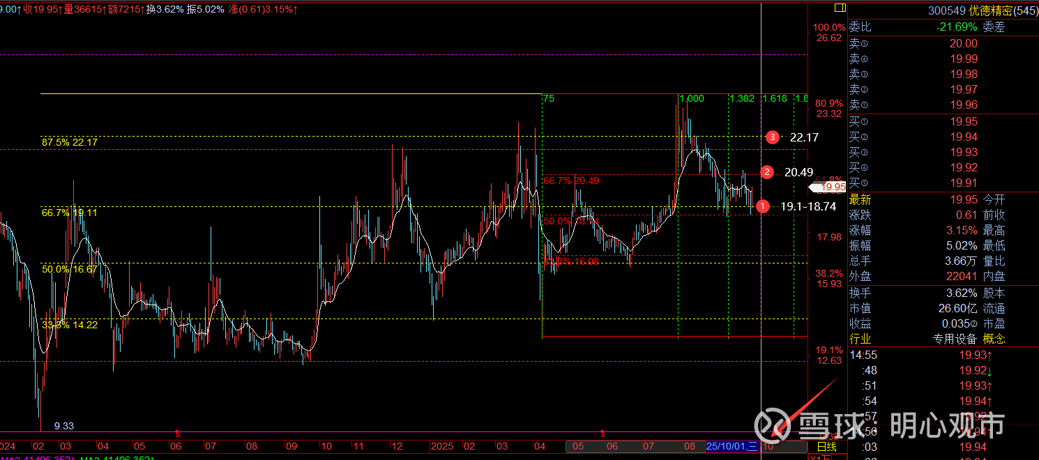 回复@如春风: $优德精密(SZ300549)$今天收在白线上,趋势是转多信号;价格上,19.1-18.74是波段支撑区,这里不破,可跟踪这个小双底形态的构筑,白线19.76上,先看20.49,能突破,再顺势看21.6-22.17,暂时只能看这个空间,后续能进一步走出后再说;时间,震荡反弹周期,节后第一天是618窗口,届时结合空间位再定性查看图片//@如春风:回复@明心观市:老师帮忙看看优德精密