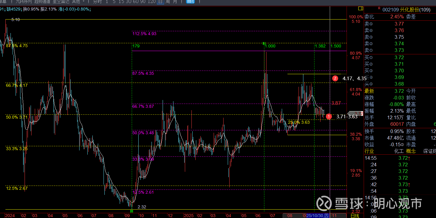 回复@臧天下者仁: $兴化股份(SZ002109)$ 趋势,今日一直在反抽白线,但还未完成突破,能突破站上3.76,即是转多信号;价格,百分比显示3.71-3.63是当前支撑区,不破3.63可跟踪对白线的收复,反压先看3.87,能突破再顺势看4.17-4.35;时间上,主跌周期已经越过,目前震荡反弹段,可重点参考价格走势;短风控参考3.63,波段风控可放在3.48查看图片//@臧天下者仁:回复@明心观市:麻烦帮看看兴化股份,谢谢