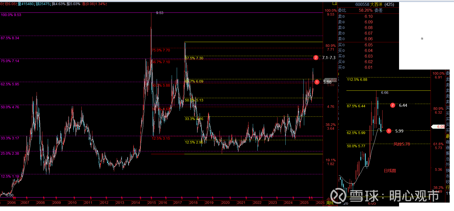 回复@火鲁鲁鲁: $大西洋(SH600558)$ 先看周图,前高是突破后的回踩,结合百分比位置5.88半分位上,仍有继续走高7.1-7.3的预期;再看日图,周五回踩白线支撑,今天冲高回落,但保持在白线上,就还属上攻态势,结合百分比,日支撑5.99,压力6.44,能突破6.44,则6.66高点会被刷新,届时看高周空间7.1-7.3;短风控参考5.99,波段风控可放在5.78查看图片//@火鲁鲁鲁:回复@明心观市:老师,请帮忙看看大西洋,谢谢!