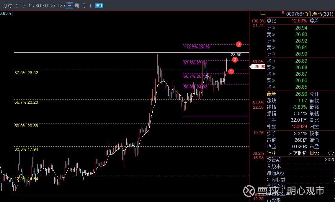 回复@信手斩龙1999: $通化金马(SZ000766)$ 28这个位置是大级别顶部的扩展位,目前日这个双头都是这个位置的压制没完成突破。极限新高类标的,以趋势跟随为主分析。目前支撑26.5-26.1不破,短线就还属强势,就还有挑战次高并刷新高点机会,跌破则转震荡,要对应防守;明天支撑26.5-26.1,反压先看27.6,能至少站到27.6上,才能重回上攻态势,届时有刷新高点去29.39机会。短风控参考26,波段风控可放在生命线25.06