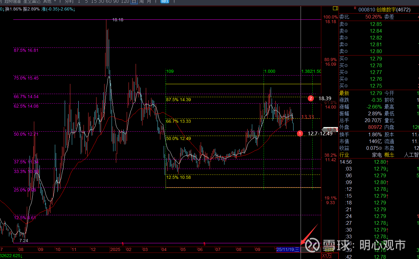回复@温柔棒棒: $创维数字(SZ000810)$ 趋势,多空线下,短线波段均为空;价格,百分百显示,已经下探至12.7-12.49半分共振区,可先跟踪该位置能否止跌回稳,反压13.3能站回,则趋势重新转多,届时再看高14.39;时间,382窗口在11月19日,能跃过去,支撑的有效性会更强;暂时来说,能在12.49-12.33区间震荡横盘,等时间消耗会更好。风控参考12.49查看图片//@温柔棒棒:回复@明心观市:能帮我看下创维数字吗