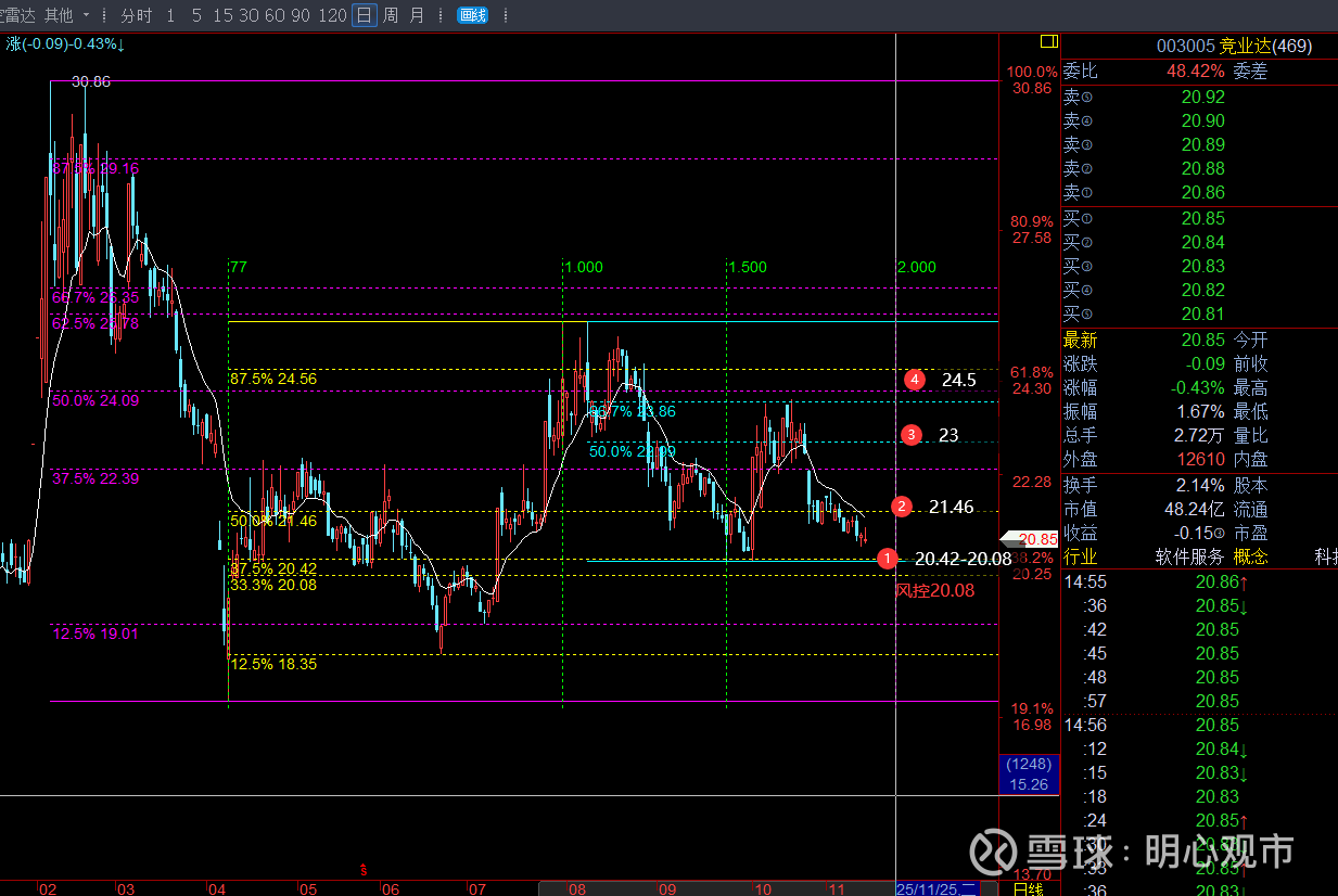 回复@银海金鲸1380796: $竞业达(SZ003005)$ 趋势,暂处于白线下,弱势为空,白线21.4,能放量突破则是转多信号;价格,已经基本靠近百分比支撑20.42-20.08,给区间可先重点跟止跌转多信号;反压21.46,突破则低点转安全,再进一步看反弹23、24.5方向;时间,这波调整周期进入末端,11月25日窗口能过去后会更充分,支撑的有效性会更强。风控参考20查看图片//@银海金鲸1380796:回复@明心观市:老师竞业达怎么看?