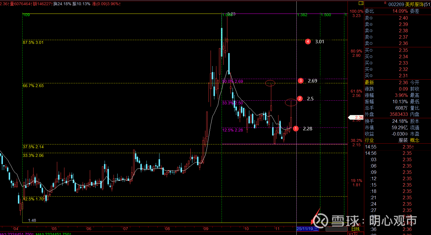 回复@风影皓月: $美邦服饰(SZ002269)$ 画圈的两个位置,基本都是百分比反压点这里可能主要还是时间上382窗口没过来,11月19日这周三跃过后,再起会更强;当前白线和百分比支撑对应2.28,该位置上,可继续跟踪反弹,压力先看2.5、2.69;能突破到2.69上,则波段内趋势进一步转强,届时重点看3.04;暂时来说,这个波段空间可预期3.01;短风控2.28,波段风控2.06查看图片//@风影皓月:回复@明心观市:老师,麻烦看看美邦服饰把,被炸了好几次板了