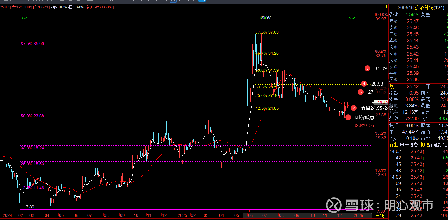 回复@静默守候着: $雄帝科技(SZ300546)$ 先看下这次低点的时空位置,1.382窗口在半分位止跌回升,是个标准的时价低点性质;随后,展开反弹,目前趋势上,突破红白多空线,短线、波段趋势是共振看多信号;价格上,结合百分比显示,当前支撑24.95-24.5,上方压力先看27.1、28.53,能进一步突破再顺势看高31.39;风控参考23.68查看图片//@静默守候着:回复@明心观市:老师能看看300546吗?