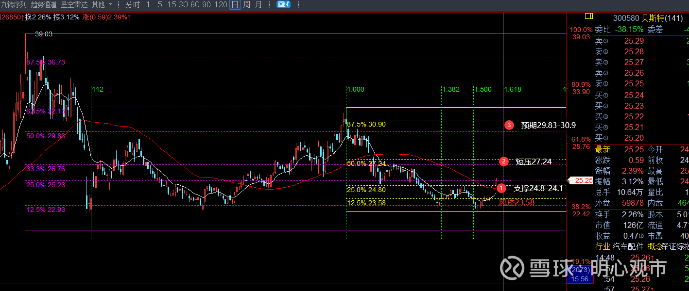回复@风影皓月: $贝斯特(SZ300580)$ 这波回调性质,形态上看暂时是针对前面20.63的次底性质,时间上,主跌期结束后依托22.9构筑小双底,目前突破到颈线位上方,这个小双底结构有走出的预期,下个窗口元旦后第一天;趋势层面,目前处于红、白多空线上方,短线波段共振看多;价格,当前支撑24.8-24.1,上方短压先看27.24,能突破则可预期29.8-30.9;风控22.9查看图片//@风影皓月:回复@明心观市:老师,麻烦分析下贝斯特好吗?感谢