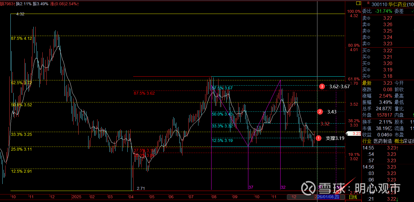 回复@小杰想学股: $华仁药业(SZ300110)$ 这波调整,在3.1一线踩了个小双底后回升。今天放量突破白线,是转多信号,但还需进一步确认;当前支撑3.19,该位置上低点安全,可进一步跟踪反弹,上方短压先看3.32,突破再顺势看3.43、3.62-3.67;暂时先看这个波动空间,1月9日是下个时间窗口,届时可跟踪对价格位的进一步确认。短期来说,先重点看3.19吧,不破,就有进一步走高,往3.43、3.62-3.67去的机会;