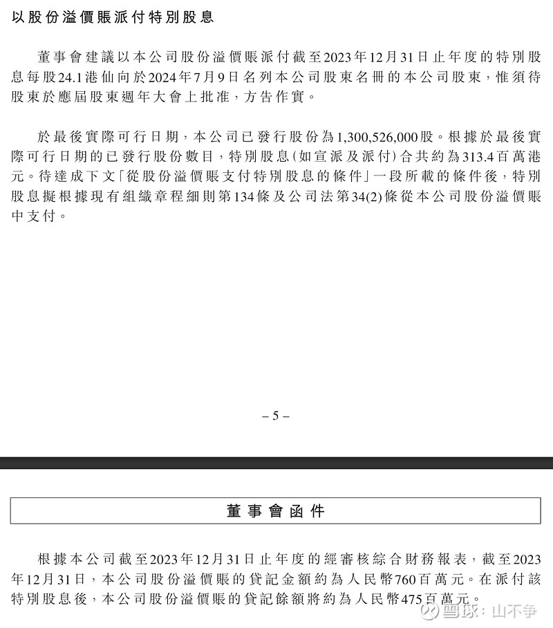 $中原建业(09982)$ $建业新生活(09983)$ 建业新生活2024年4月2日停牌,4月24日复牌,6月4日即公布特别派息,彼时动用的是股份溢价账户(类似资本公积金),总计7.6亿派发2.85亿;而中原建业中报显示股本溢价和保留溢利(未分配利润)合计21亿多,按照相似的特别股息比例,派息达7.87亿,是现在市值的接近两倍,实际比例应该更高(用保留溢利派息比股份溢价账户派息更合理),大股东有充分的派息意愿和能力。
