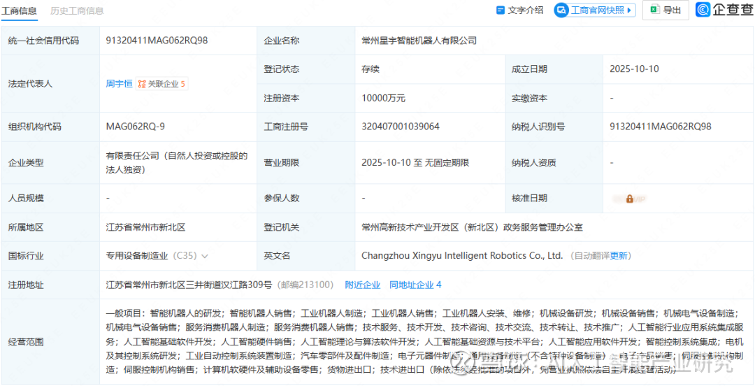10月11日,企查查官网消息,星宇股份全资成立了常州星宇智能机器人有限公司(以下简称“星宇智能”),注册资本高达1亿元人民币。