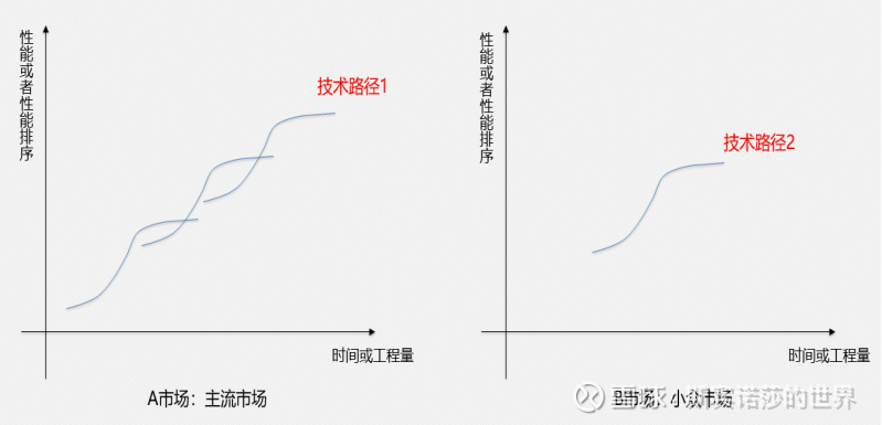 拼多多第二步,如图例下方蓝色曲线走势一样,提升产品性能,逐步侵入主流市场。拼多多电商产品性能的提升肯定快于淘天和京东。一旦满足主流市场需求,便会发生出现临界点,开始抢主流市场客户。比如拼多多推出百亿补贴,千亿扶持,黑标产品,皆是提升产品性能,逐步侵入主流市场的举措。