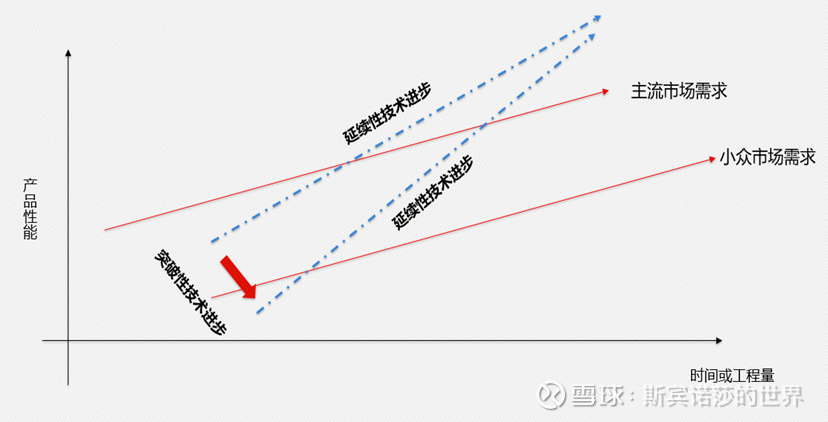定性的逻辑还是突破性创新模式,我在很多文章已经说过了,比如《再看突破性创新》。突破性创新模式是由克里斯坦森提出,他将技术创新分为延续性技术创新和突破性技术创新。延续性创新是既有价值网络的进一步升华,不管是技术还是商业模式都没有本质的改变。而突破性创新则不同,它率先在小众市场发起,构建不同的价值网络,技术原理和商业模式与主流市场都有着本质的区别。