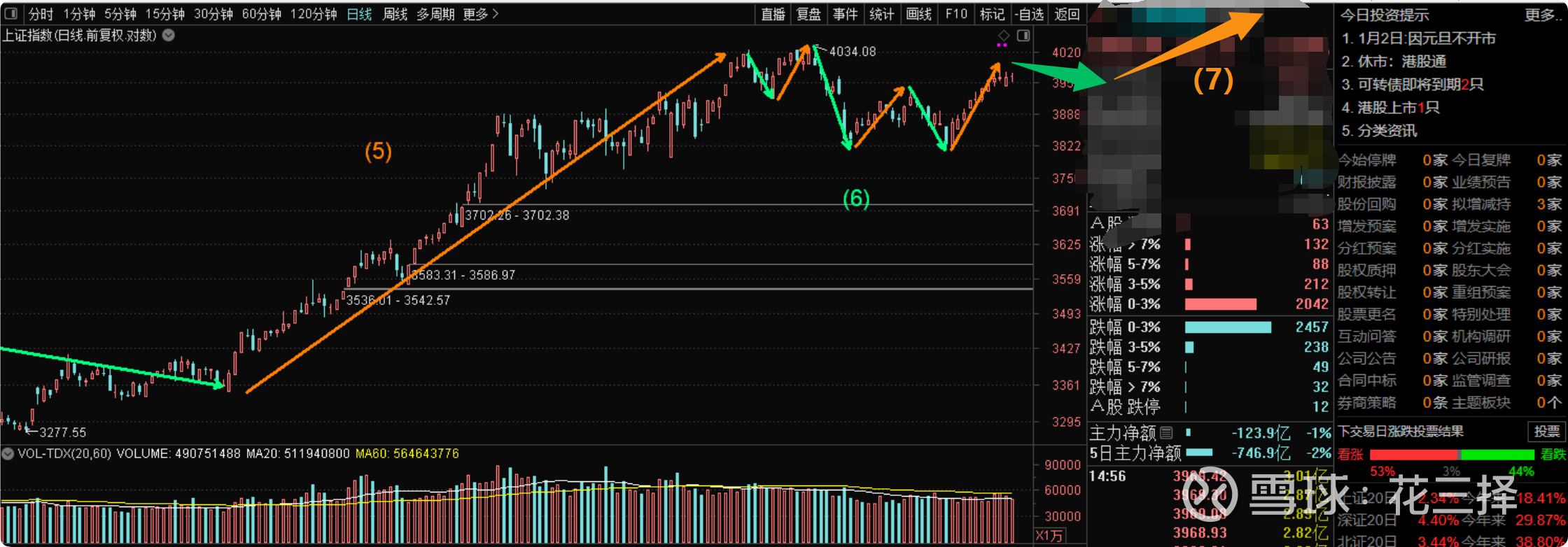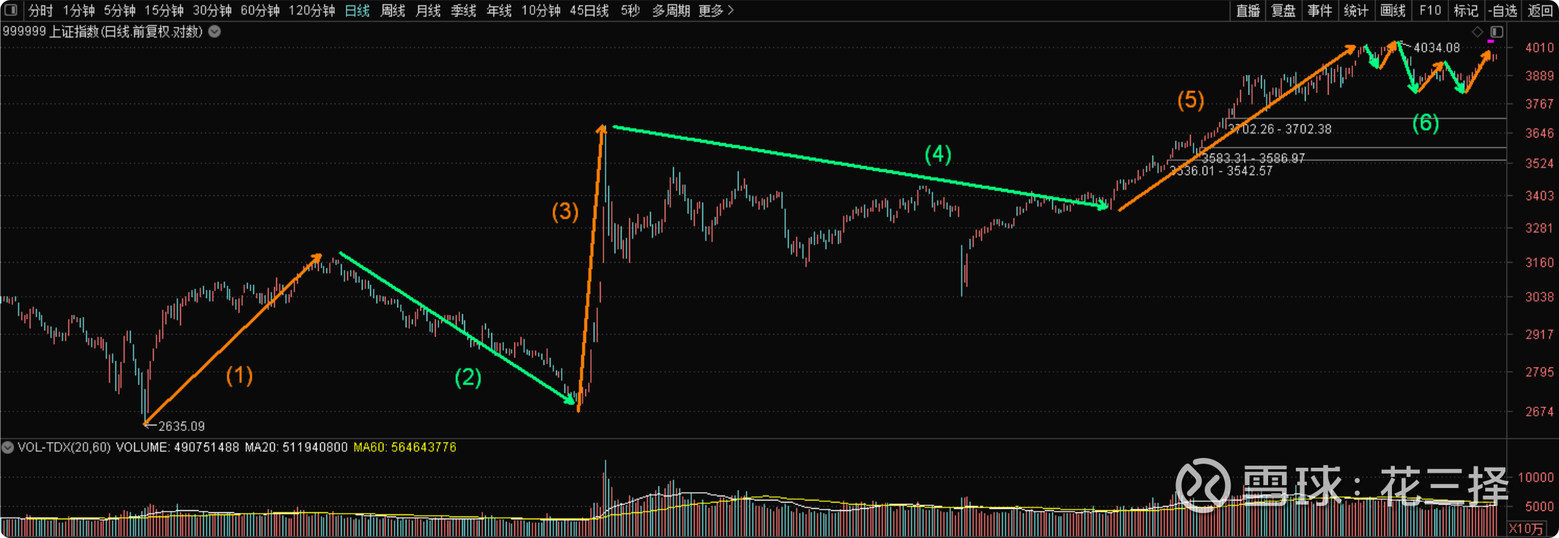 上证现处于第五大浪中,我修改了原用的5浪模型数浪方式,按一涨一跌的模式来数,可能更符合慢牛的走法。