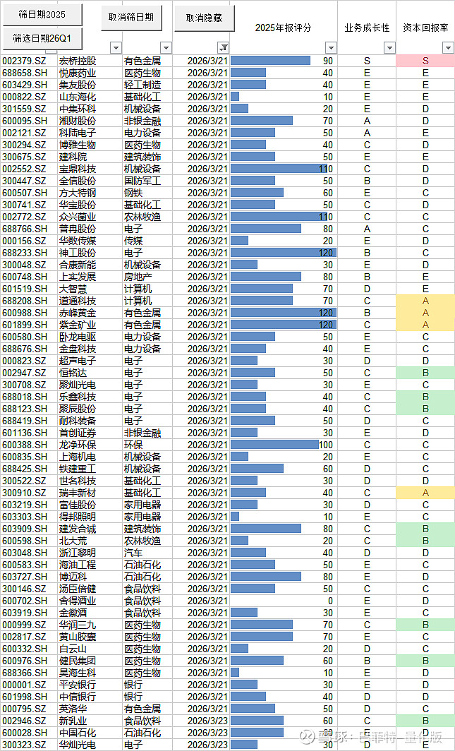 2025年报评分看板vol.7:周五加周末共58家上市公司披露财报,超预期个股不多,模型给赤峰黄金和紫金矿业满分评价,去年金价在高位取得好的业绩也正常,但Q1金价铜价均有下跌,小心。消费股也没有看到反转的信号,三线白酒如舍得、金徽酒报表增速进一步下滑,倒是$新乳业(SZ002946)$ 可以关注一下,归母净利率同比+36%,单Q4同比+69%,业绩小超预期,“鲜酸双强”策略执行得不错。科技方面可以关注$恒铭达(SZ002947)$ ,消费电子的精密结构件,从外壳向内部核心精密件渗透,通信+新能源可以成为第二增长曲线,可以关注折叠屏、昇腾的产业链变化,未来有不少的催化,只是目前机构调研得比较充分,股价会比较狗吧![]()