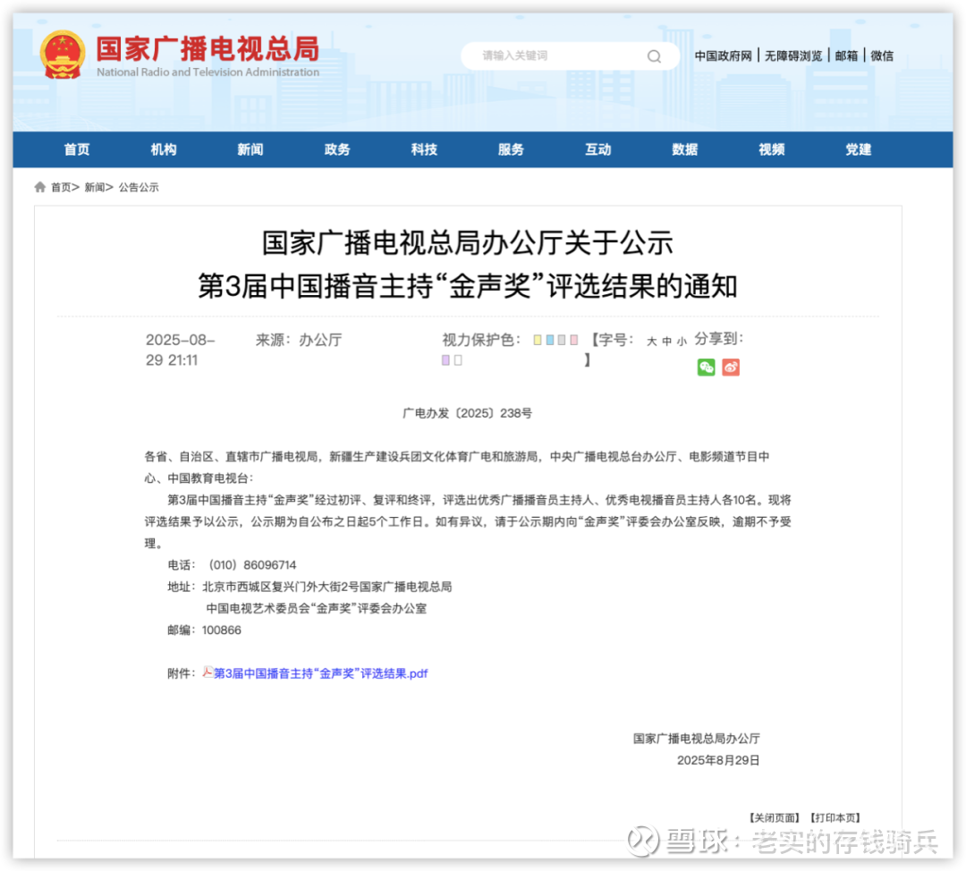 近日,国家广播电视总局发布《关于公示第3届中国播音主持“金声奖”评选结果的通知》:第3届中国播音主持“金声奖”经过初评、复评和终评,评选出优秀广播播音员主持人、优秀电视播音员主持人各10名。目前,评选结果正在公示中,公示期为自公布之日起5个工作日。
