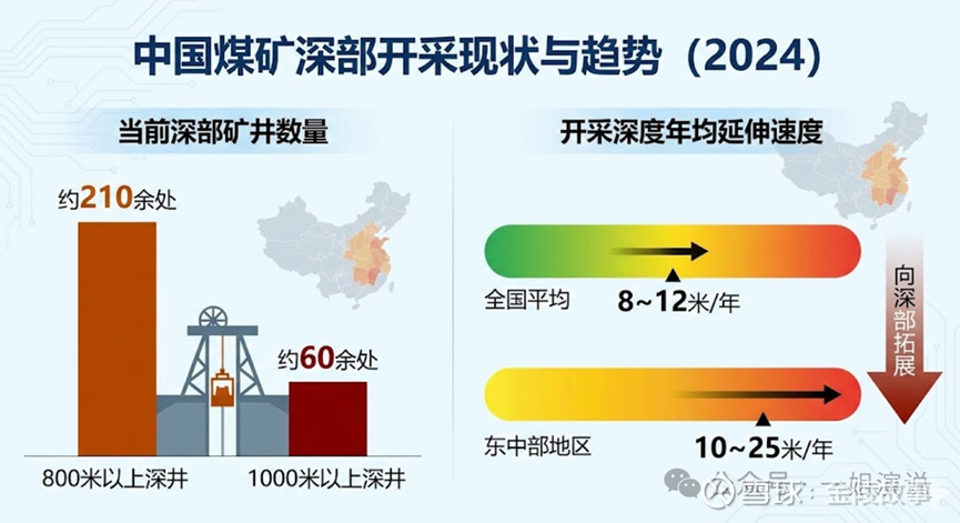 目前,我国煤矿平均开采深度接近500米,其中800米采深煤矿有210余处,千米深井有60余处。当前全国开采深度正以平均每年8~12米的速度向深部拓展,预计2030年前后,多数矿井将进入千米深井开采阶段。其中东中部地区多数煤矿已率先进入深部开采阶段,开采延伸速度达到每年10~25米。深部资源开采呈现高地应力、高地温、高渗透压、强烈开采扰动的显著特征,生产建设投入、灾害治理难度、装备适配要求大幅提升,相关研究表明,井深每增加100米,吨煤生产成本增加10%-25%。