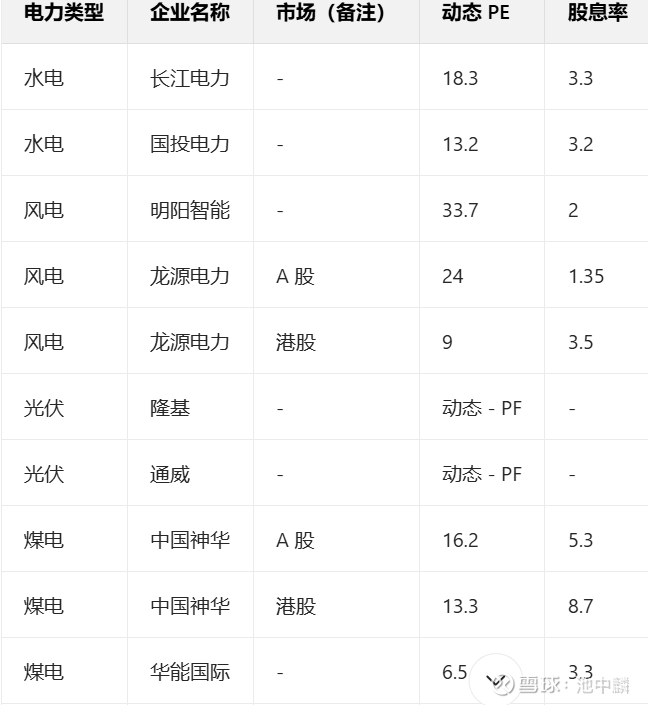 华能国际(煤60%,其它30%左右,但是水电少,光和风多一点):动态 6.5PE 股息3.3
