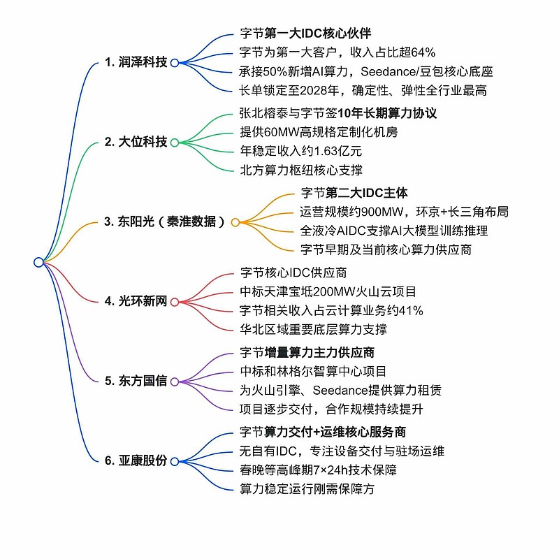 润泽科技是字节第一大IDC核心伙伴,字节为其第一大客户,收入占比超64%,承接字节约50%新增AI算力,廊坊智算中心是豆包、Seedance 2.0核心算力底座,上架率近满产,长单锁定至2028年,合作深度、确定性、弹性全产业链最高。