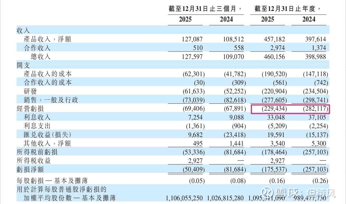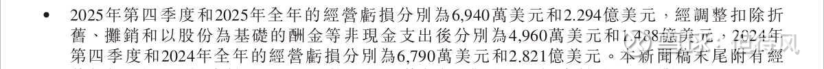 更重要的是,亏损收窄了。全年经营亏损2.294亿美元,比2024年的2.82亿少了近20%。调整后经营亏损更是只有1.488亿美元。