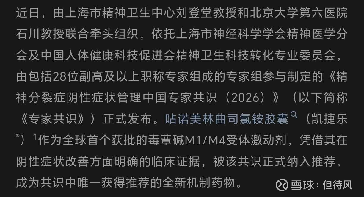 这玩意儿有多重要?再鼎总裁Josh Smiley的原话是:“KarXT是再鼎重要的新增增长引擎”。而且还没上市,已经被写进了国家精神分裂症专家共识。这波操作属于“枪还没响,靶子上已经画好了十环”。