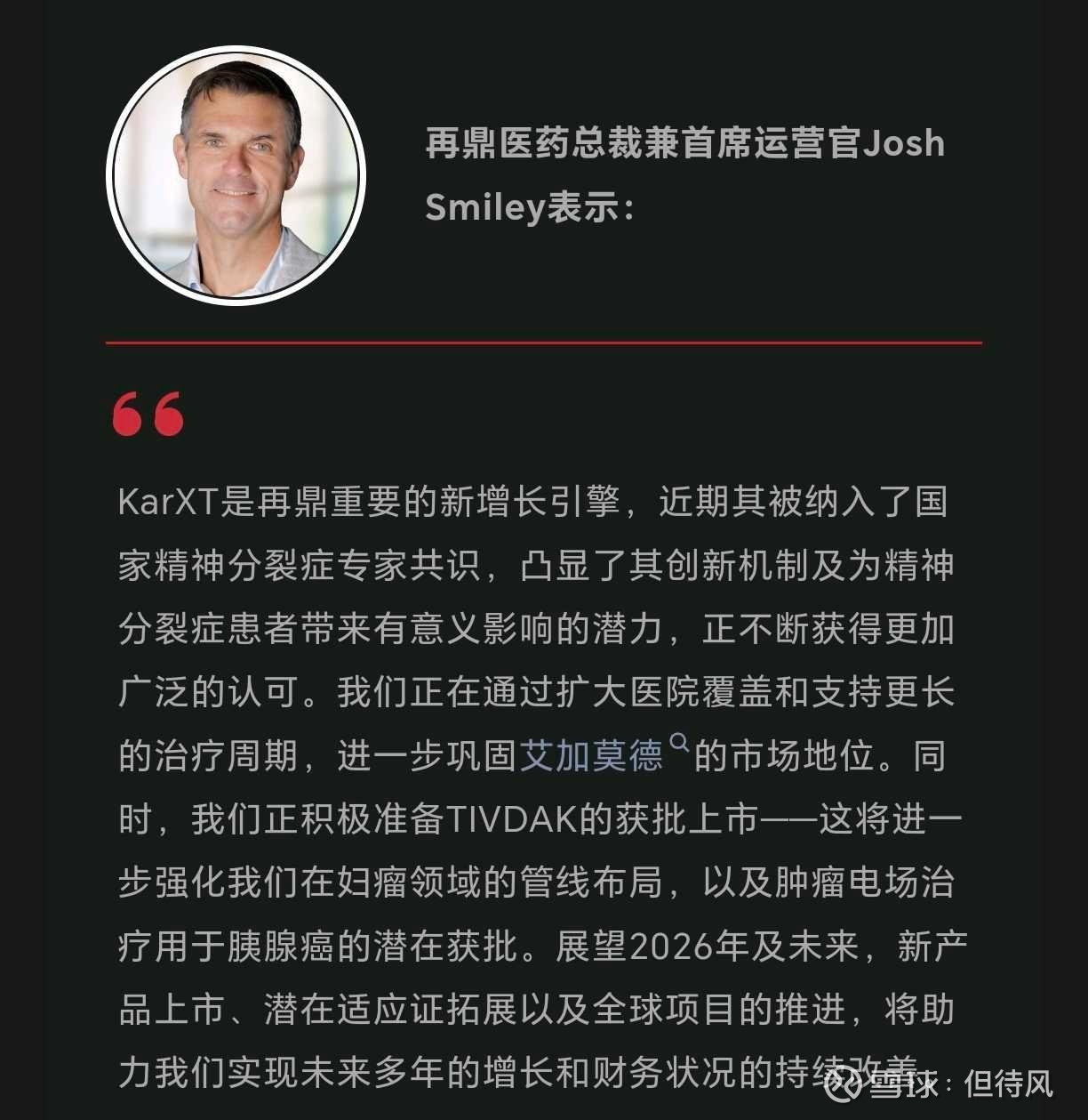 至于那个绕不开的话题——杜莹减持。这次只说一句:减持归减持,管线归管线。 把这件事放在投资决策的权重里,给它5%的份额就够了。剩下的95%,留给4.6亿的营收、留给593%增长的鼎优乐、留给68.4%客观缓解率的zoci、留给即将上市的KarXT和TIVDAK。
