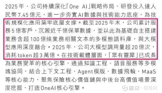 截至2025年末,公司累计服务5亿客户,沉淀近千亿保单数据,自建包含超100亿条业务相关文本的多模态语料库。2025年,公司大模型调用量超20亿次,token消耗超3万亿。
