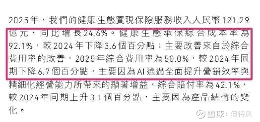 从经营效率来看,技术投入已经在财务数据中体现出来。2025年,众安健康生态综合成本率同比改善3.6个百分点至92.1%,主要得益于AI赋能提升营销和运营效率,推动费用率下降6.7个百分点。