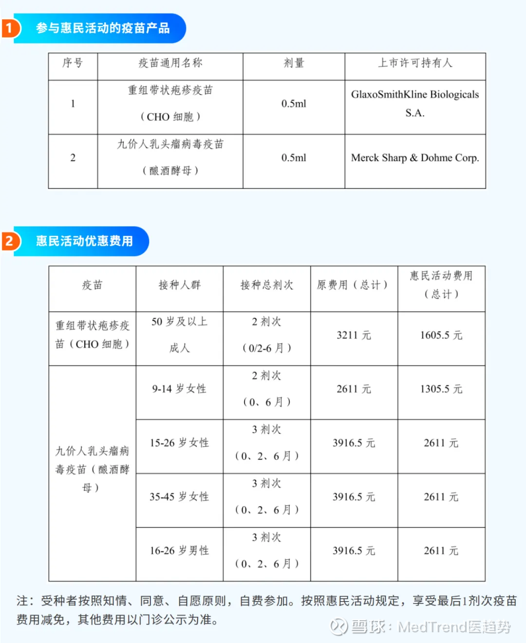 纳入惠民活动的疫苗包括默沙东的九价人乳头瘤病毒HPV疫苗,以及GSK的重组带状疱疹疫苗欣安立适(CHO细胞)。