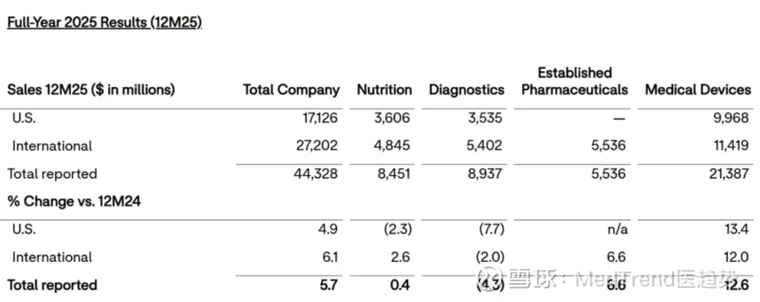 雅培2025年全年营收443.28亿美元,同比增长5.7%,其中: