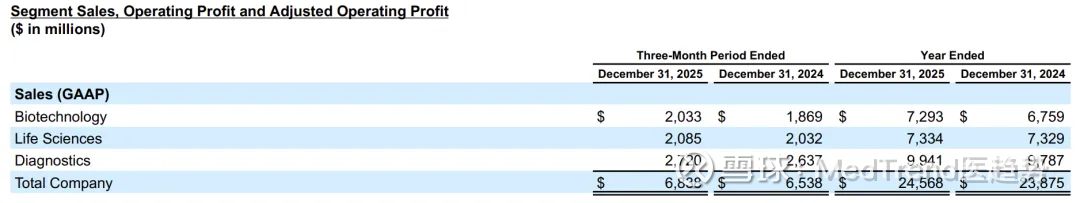 丹纳赫2025年营收245.68亿美元,同比增长2.9%,超过了分析师平均预期。其中: