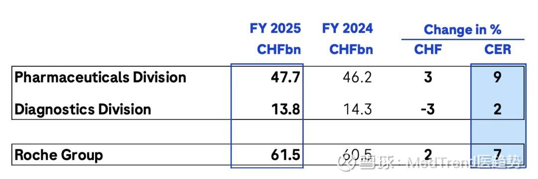 罗氏2025全年营收615.16亿瑞士法郎(约744.28亿美元,1瑞士法郎=1.2099美元),同比增长1.7%。其中:
