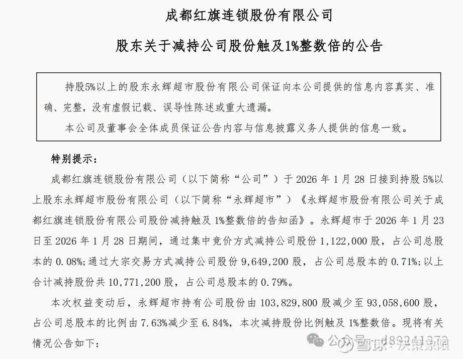 到2025年7月21日又完成对红旗连锁的减持,数量为1377.05万股,涉及金额约为8663万元,因此永辉对后者的持股比例进一步降至9.99%;同年8月9日至10月16日,永辉超市再度减持红旗连锁1359.96万股,涉及金额8105万元,持股数量降至8.99%。