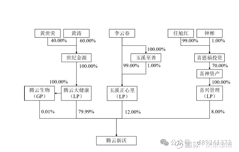 腾云新沃的合伙人一共有4位,即腾云大健康、腾云生物、喜兴管理、玉溪正心里,持有份额分别为79.99%、0.01%、12%、8%,其中腾云生物为GP。
