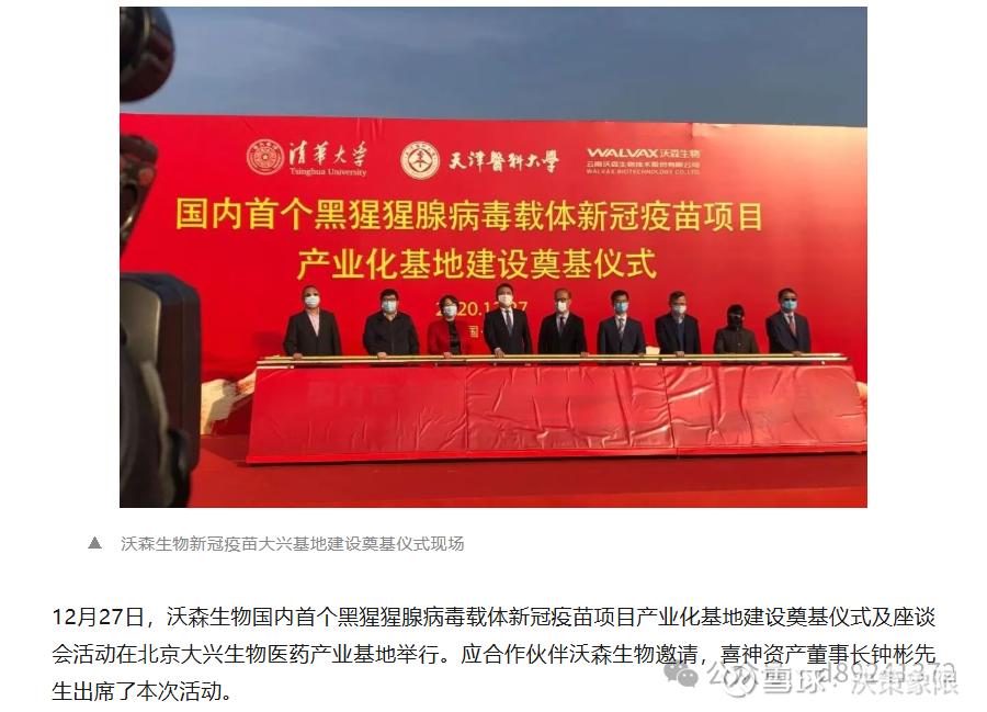 到2020年12月末,喜神资产在公众号中指出,沃森生物国内首个黑猩猩腺病毒载体新冠疫苗项目产业化基地建设奠基仪式及座谈会活动在北京大兴生物医药产业基地举行。应合作伙伴沃森生物邀请,喜神资产董事长钟彬先生出席了本次活动。