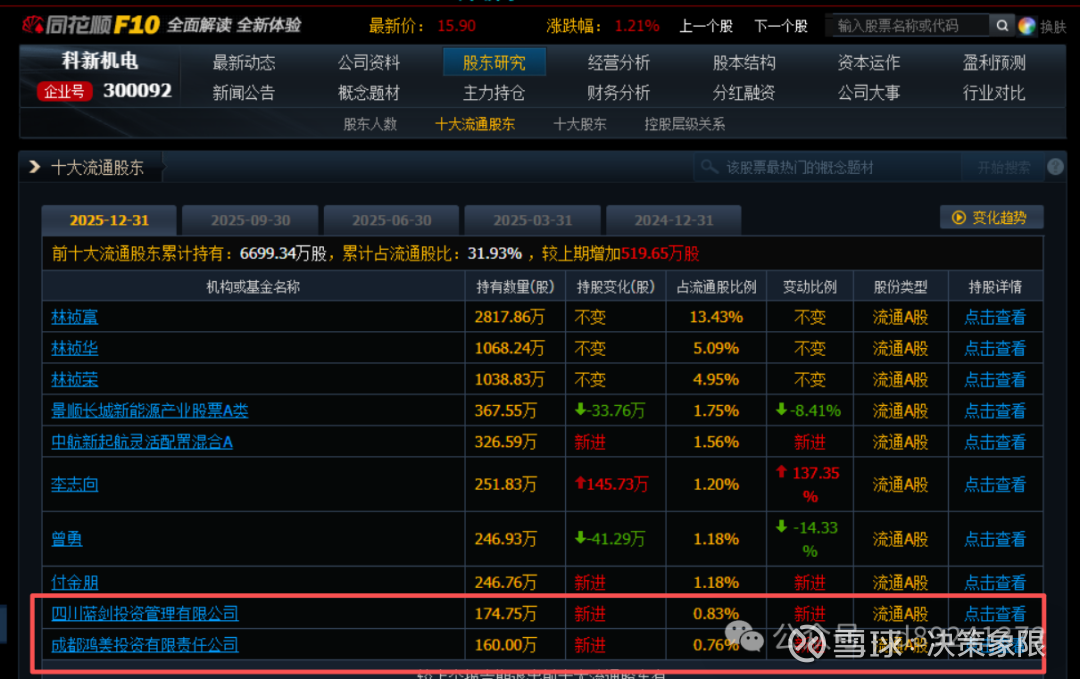具体来看四川蓝剑投资管理有限公司、成都鸿美投资有限责任公司分别以174.75万股、160万股,新进成为科新机电的第九大、第十大流通股东。