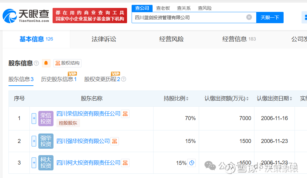 天眼查穿透后发现,四川蓝剑投资股东有三位,即四川荣信投资有限责任公司,四川华强投资有限公司、四川柯大投资有限责任公司,持股比例分别为70%、15%、15%,控股股东荣信投资由曾清荣、曾勇分别持有,持股比例分别为90%、10%。2007年四川新闻网-成都商报讯指出,荣信投资的股东就是曾清荣和他的儿子曾勇。