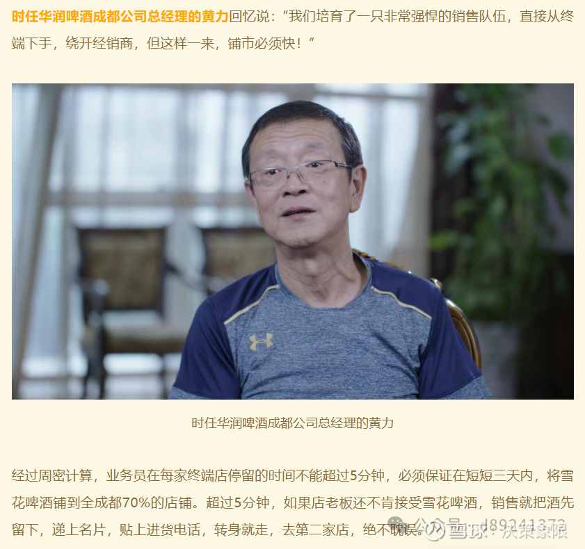 该文章娓娓道来,华润的销售团队赶在人们用餐前,将旗下啤酒品牌雪花送到这个城市的每一个角落。要知道当时蓝剑是四川绝对的霸主,作为一个外来和尚,雪花不走寻常路,直接抄了竞争对手的后路——终端铺市。