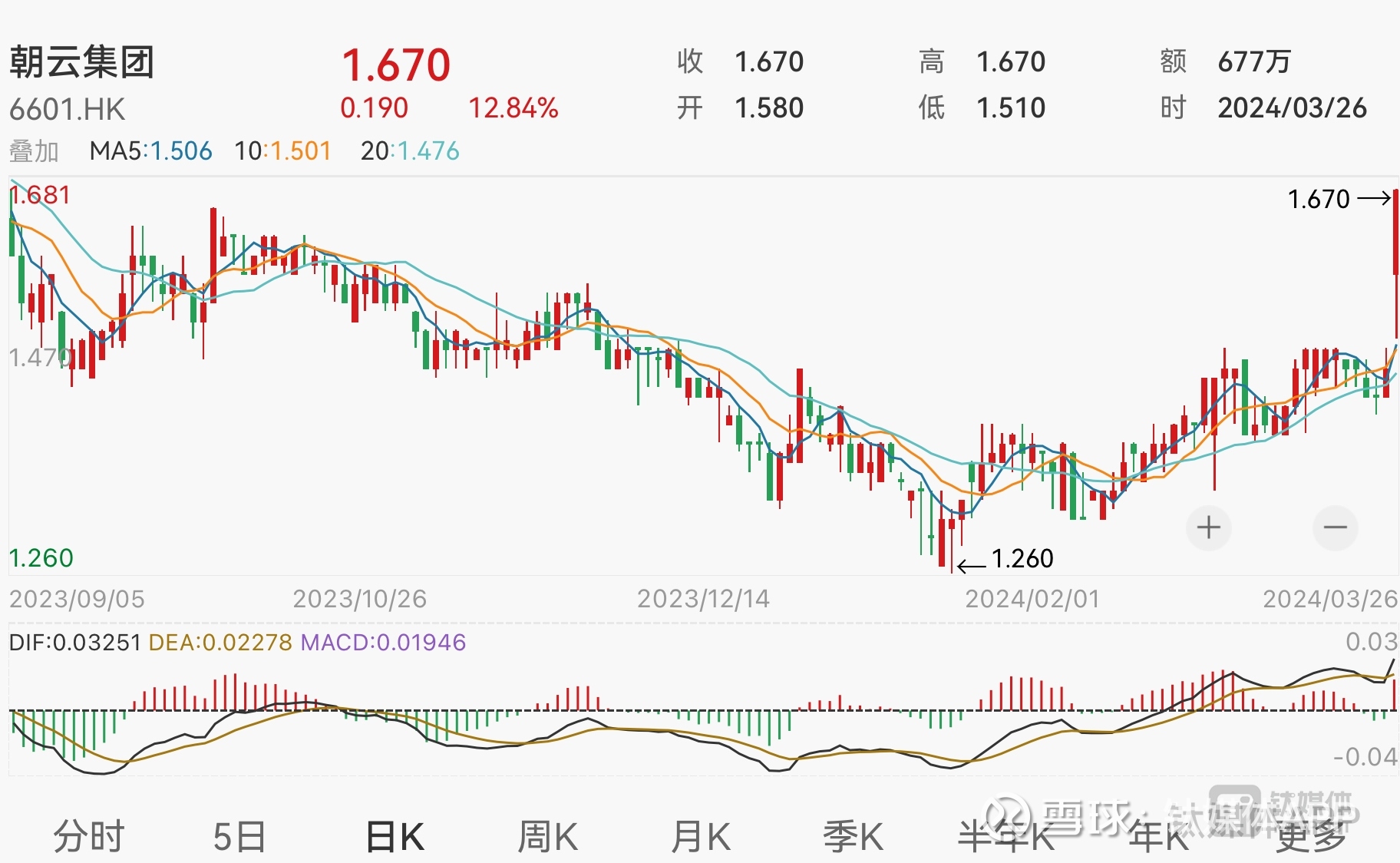 二级市场方面,受到业绩向好的正向带动,3月26日港股开盘后,朝云集团便迎来上涨,午盘一度涨超11%。截至今日收盘,公司股价报收涨12.84%,报1.67港元,为近7个月来的阶段新高,当前总市值约21.6亿港元。