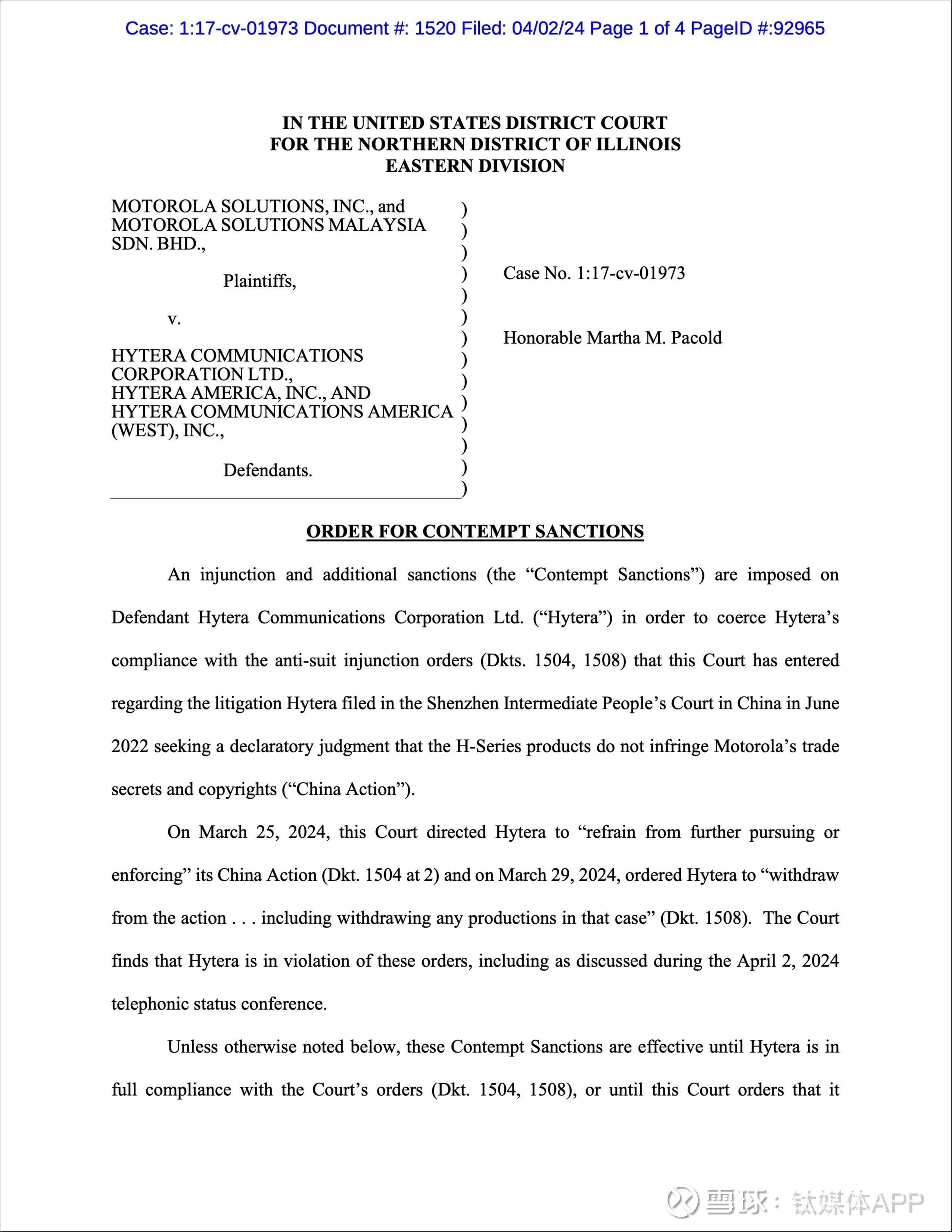 三、禁止依赖中国诉讼中的任何命令或判决:海能达被命令在中国诉讼中关于H系列产品的藐视程序结束之前,不得执行或依赖深圳法院在中国诉讼中发布的任何命令或判决。此命令于2024年4月2日发布。法官为Martha M. Pacold。