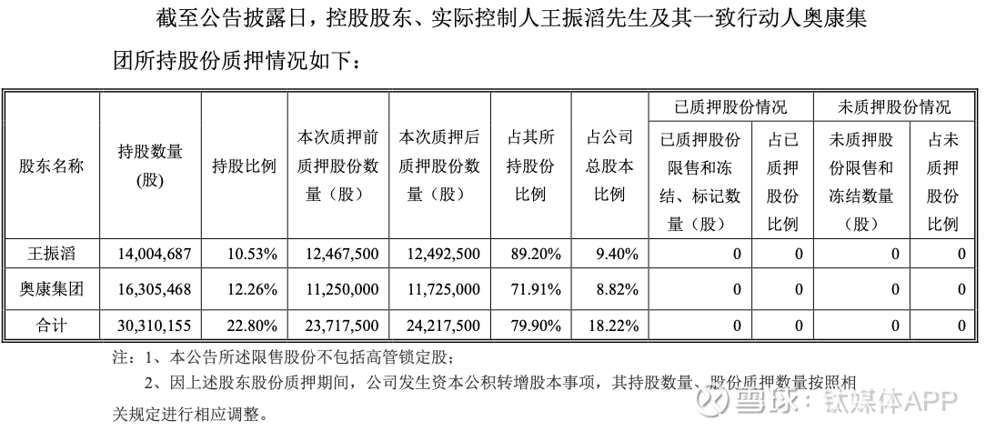 值得注意的是,根据最新的质押公告,王振滔89.20%持股已经被质押,奥康集团71.91%持股也被质押。同时,王振滔持有的奥康国际股权质押比例高达99.08%,奥康投资质押比例也达到69.36%。