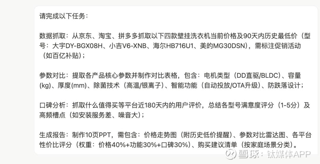 第一个任务是让Manus为消费者比较四款壁挂洗衣机。这是一个典型的消费决策场景,考验AI的综合能力:需从多个电商平台抓取价格数据、整理产品参数,并分析用户评价。