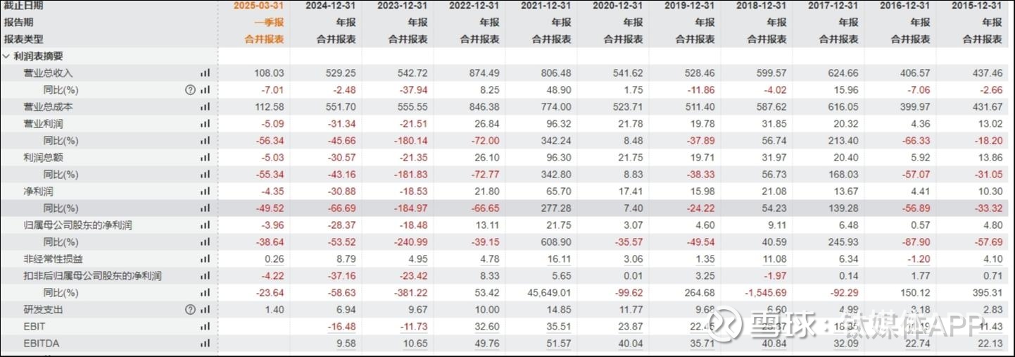 进入2024年,公司亏损进一步扩大。当年公司实现营业收入529.25亿元,同比下滑2.48%;归母净利润亏损28.37亿元,同比下滑53.52%;扣非净利润亏损达到37.16亿元。