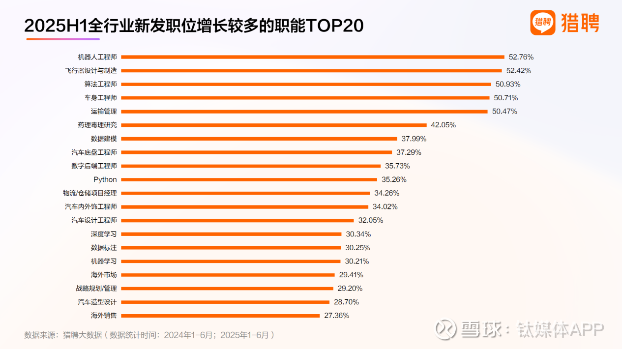 在国内外经济形势等多重因素影响下,猎聘平台上半年新发职位稳中略降,活跃人才持续增长,同比增长11.89%,就业市场求职竞争加剧。与此同时,猎聘观察到,在以人工智能、新能源汽车等为代表的新兴产业的带动下,一些科技属性较强的技术岗正持续释放岗位需求,展现出强劲的发展潜力。