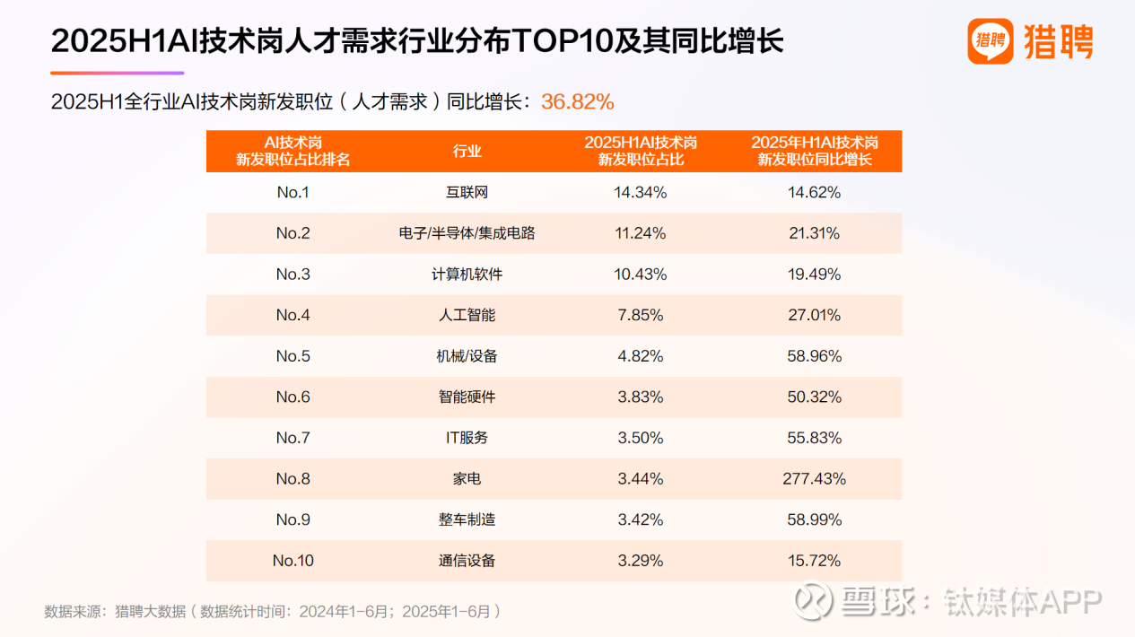 2025上半年AI技术新发职位(人才需求)整体增长显著,为36.82%。其职位遍布各个行业,充分证明了AI+与各行业融合的趋势。其中互联网、电子/半导体/集成电路、计算机软件占比位居前三。从占比TOP10行业的AI技术新发职位的同比增长来看,家电行业的AI技术职位增长最快,为277.43%。随着智能家居产品的加速普及,AI技术已深度融入日常生活场景。智能家电的蓬勃发展不仅有效拉动内需,更让普罗大众切身感受到AI技术带来的生活品质提升。