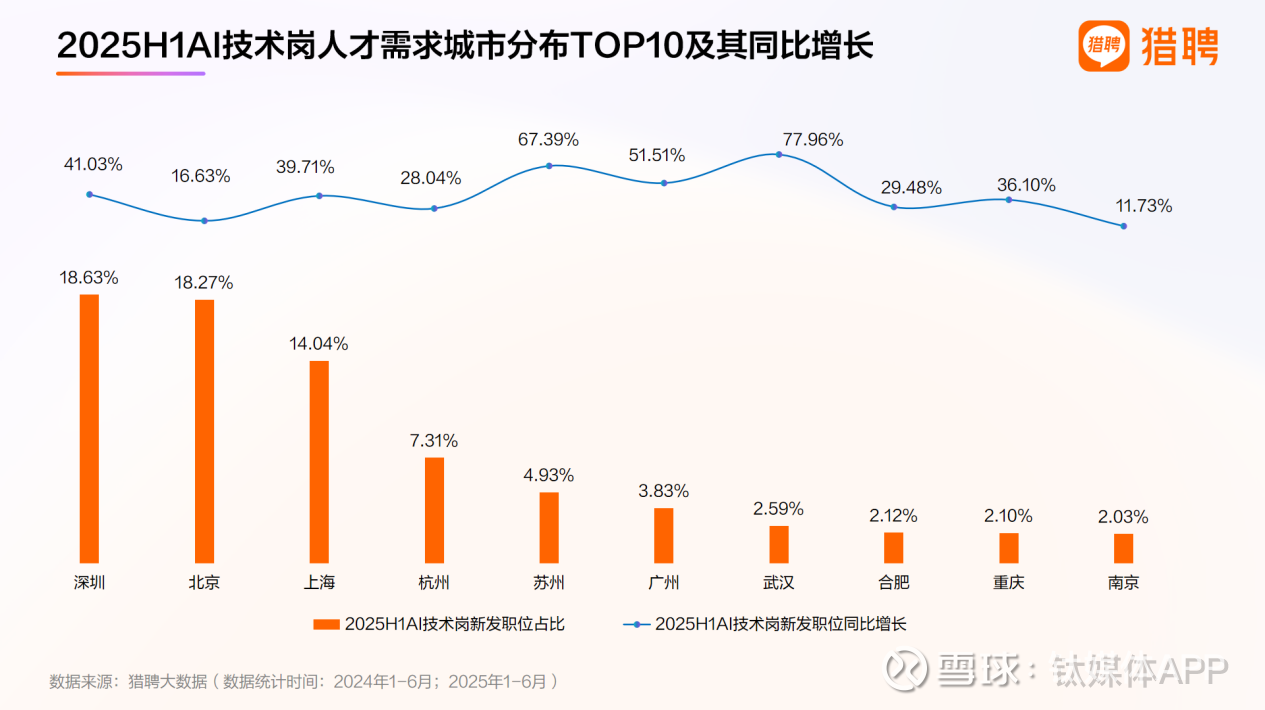 2)深圳北京上海AI技术岗占据半壁江山,武汉苏州AI技术岗增速最快