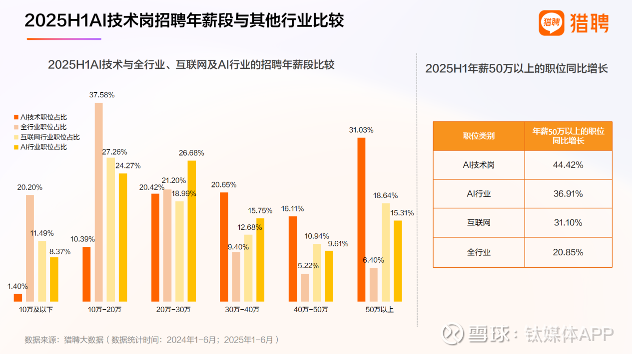 1、AI技术岗高薪化优势突出,50万以上的岗位占比和增速远超热门行业