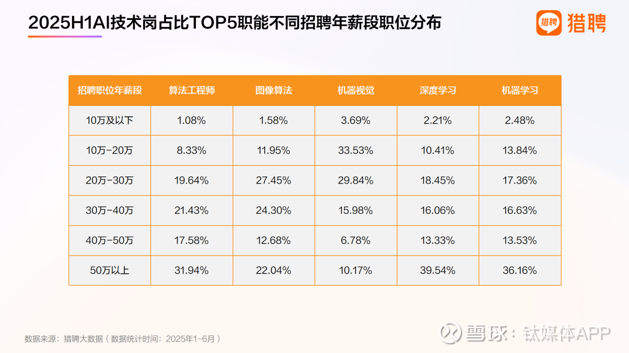 猎聘大数据显示,50万年薪以上的AI技术岗占比高达31.03%,远超全行业(6.40%)、互联网行业(18.64%)和AI行业整体(15.31%)的水平。从增速来看,2025上半年AI技术岗50万年薪以上职位同比增长达44.42%,显著高于互联网行业(刚突破30%)和AI行业整体(36.91%)的增速。这充分印证了AI技术岗位的市场稀缺性和高含金量,使其成为企业竞相争夺的核心人才资源。