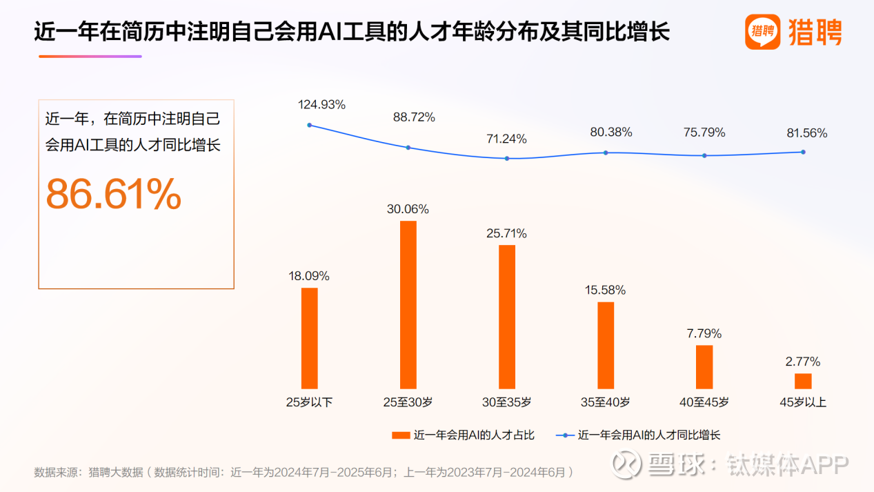 AI工具的普及正在推动一场技术平权运动,为各年龄段求职者创造公平竞争环境。猎聘大数据显示,近一年在简历中标注AI技能的人才数量同比增长86.61%,其中25-30岁群体占比最高,为30.06%。而最令人振奋的是,45岁以上群体的AI技能掌握率增速达81.56%,仅次于年轻群体,这一现象打破了“技术是年轻人专利”的固有认知。AI技术正在成为大龄求职者突破年龄壁垒的有力工具,通过掌握新兴技能,他们获得了与年轻从业者同台竞技的机会,实现了职业发展的“数字重生”。这场技术平权运动不仅重塑了职场竞争格局,更让终身学习成为可能,为各年龄段人才开辟了更广阔的发展空间。