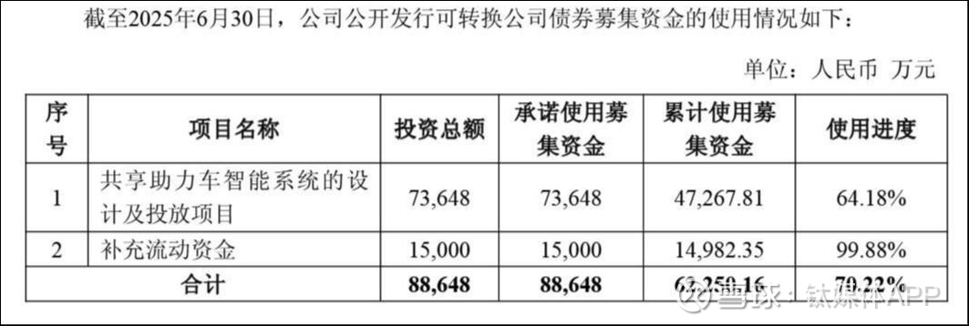 核心募投进展缓慢,印证了永安行的困局。公司2020年年底发行的8.86亿元可转债,主要用于“共享助力车智能系统的设计及投放项目”及“补充流动资金”。截至2025年6月30日,核心募投项目“共享助力车项目”募资使用进度仅为64.18%,部分城市项目投资进度远不如预期。